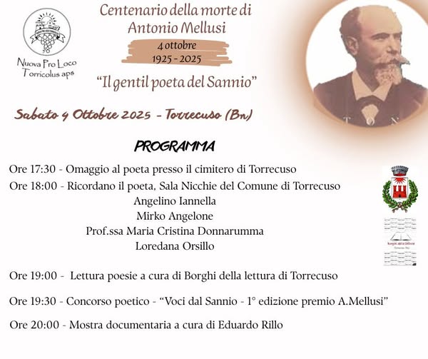 A 100 anni dalla sua morte, la Nuova Pro Loco Torricolus Aps – insieme al Comune di Torrecuso e a Borghi della Lettura – rende omaggio ad Antonio Mellusi, poeta che con i suoi versi ha raccontato l’anima del nostro Sannio.